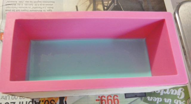 Zelf heb ik voor deze zeep geen parfumolie gebruikt, waardoor de zeeplijm snel indikt, maar heb ik gewoon de eerste en later de tweede laag van de zeep bespoten met een nevel van ethylalcohol. Dit zorgt ervoor dat het oppervlak van de zeep heel snel stolt, waardoor het mogelijk wordt om rechte lijnen te maken tussen de afzonderlijke lagen zeep.