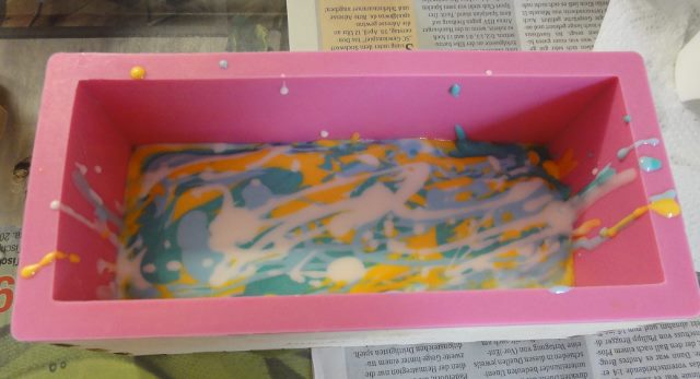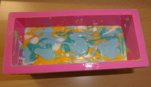 Je kunt nu de zeeplijm die je voor de tweede laag hebt voorzien in verschillende kleinere potjes verdelen en deze naar wens kleuren. Verdeel vervolgens de gekleurde stukjes over de eerste laag DIY zeep op dezelfde manier als je hebt gedaan met de Spoon Swirl marmering. Spuit vervolgens nog een nevel van ethylalcohol op de gekleurde laag en ruik het laatste deel van de zeep en giet het in de zeepmal.