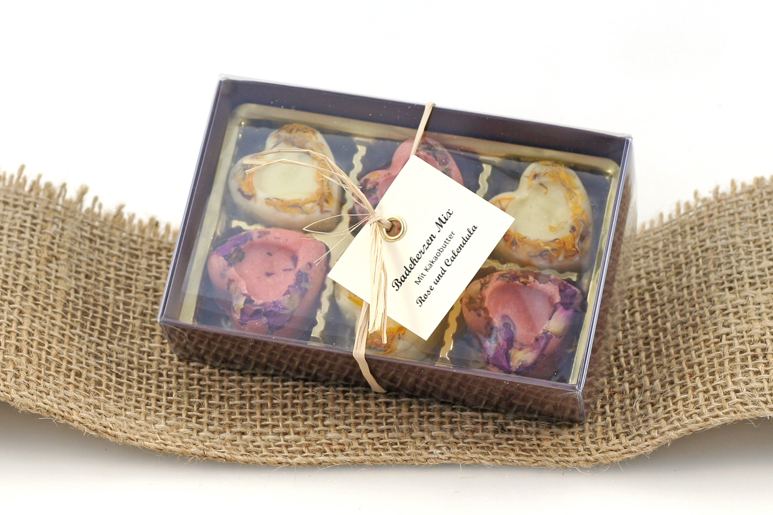 Er is bijna niets makkelijker dan zelf mooie badchocolaatjes maken. Het leuke is dat je je niet hoeft te beperken tot één vorm, maar de badpralines bijvoorbeeld in de vorm van een hart kunt maken, ze in de vorm van stokjes kunt gieten of kerst-, dieren- of heel andere motieven kunt maken. Badpralines bestaan meestal uit een vast vet zoals cacaoboter, sheaboter, mangoboter enz., zuiveringszout en citroenzuur. Het is ook nuttig als SLSA – natriumlaurylsulfoacetaat -, mulsifan of een andere oppervlakteactieve stof aan de badpralines wordt toegevoegd. Het voordeel hiervan is dat het vet van de badpralines niet op het badwater drijft en de badkuip niet vettig blijft na het bad.