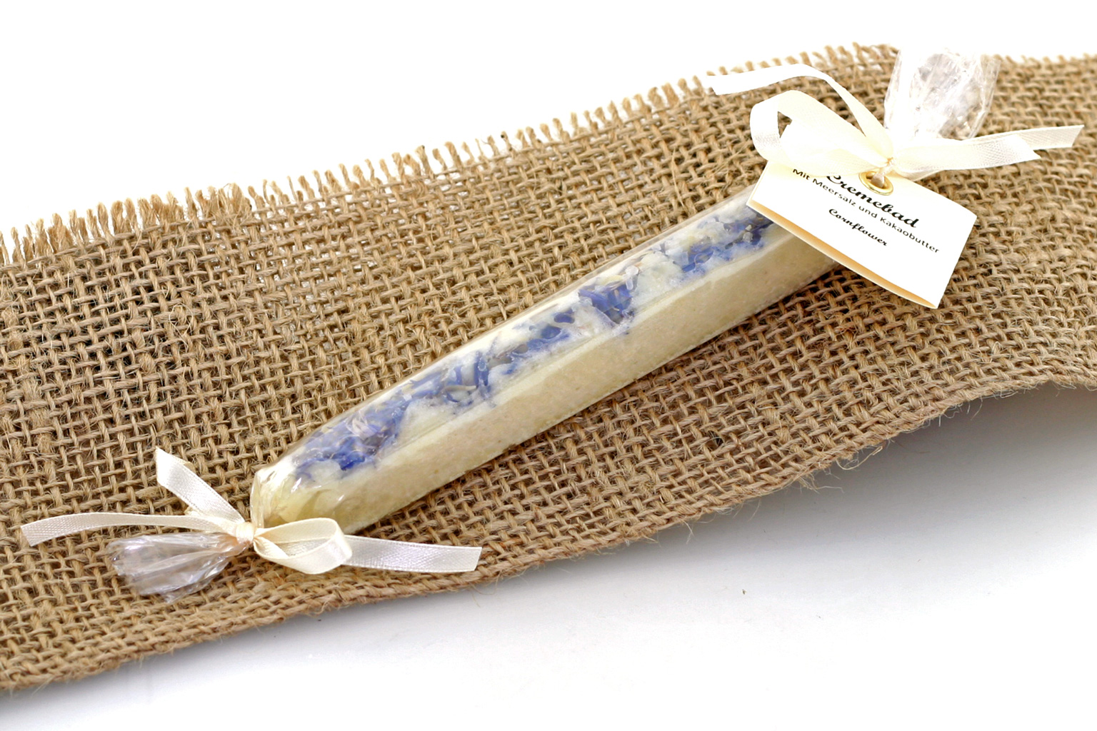 Onlangs bezocht ik een bekende parfumerie om de laatste trends te ontdekken. Hoewel ik veel producten zelf maak, vind ik het leuk om iets mee naar huis te nemen en verschillende producten uit te proberen. Uiteindelijk koos ik voor een bath stick van “Badefeeling” voor 3,95 euro. De badsticks zaten allemaal verpakt in een bijpassend doosje. Ze breken heel snel, dus je kunt zeker niet zonder de verpakking als je ze verkoopt. Er zijn ongelooflijk veel soorten van deze sticks en het was moeilijk om te beslissen welke ik zou kopen.