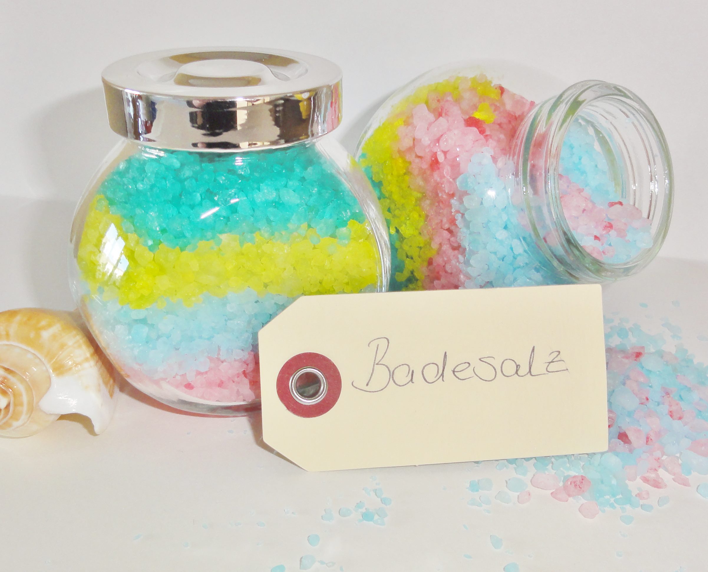 Omdat ik vaak de vraag krijg of bepaalde doe-het-zelf ideeën ook geschikt zijn om met kinderen te maken, wil ik graag een doe-het-zelf recept presenteren dat ook zonder problemen met kinderen gemaakt kan worden. Ons badzout bestaat uit slechts een paar ingrediënten: zout, kleurstof voor levensmiddelen en essentiële oliën of parfumoliën. We raden aan om Dode Zeezout te gebruiken, omdat dit zout de meeste mineralen en sporenelementen bevat en ook geschikt is voor een problematische huid. Je kunt hier meer lezen over Dode Zeezout: Maak je eigen badzout met Dode Zeezout.