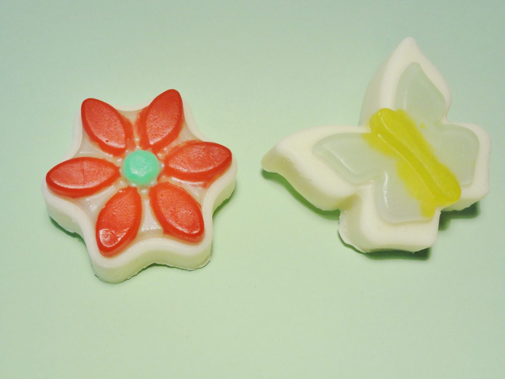 Voor deze kleurrijke gastenzeepjes koos ik een eenvoudige siliconenmal met lentemotieven. De holtes van de siliconen mallen werden gevuld met felgekleurde zeeplijm. Ik gebruikte een klein lepeltje en goot het zeepmengsel druppel voor druppel in de holtes van de mal. Een vaste hand is hierbij een voordeel. Mocht er toch iets misgaan, dan kun je de zeep nog wegvegen met een wattenstaafje of doekje. Het beste is om de eerste laag zeep kort te laten drogen. Zo voorkom je dat het zich vermengt met de overgebleven zeeplijm, die vervolgens zoals gebruikelijk in de zeepmal wordt gegoten.