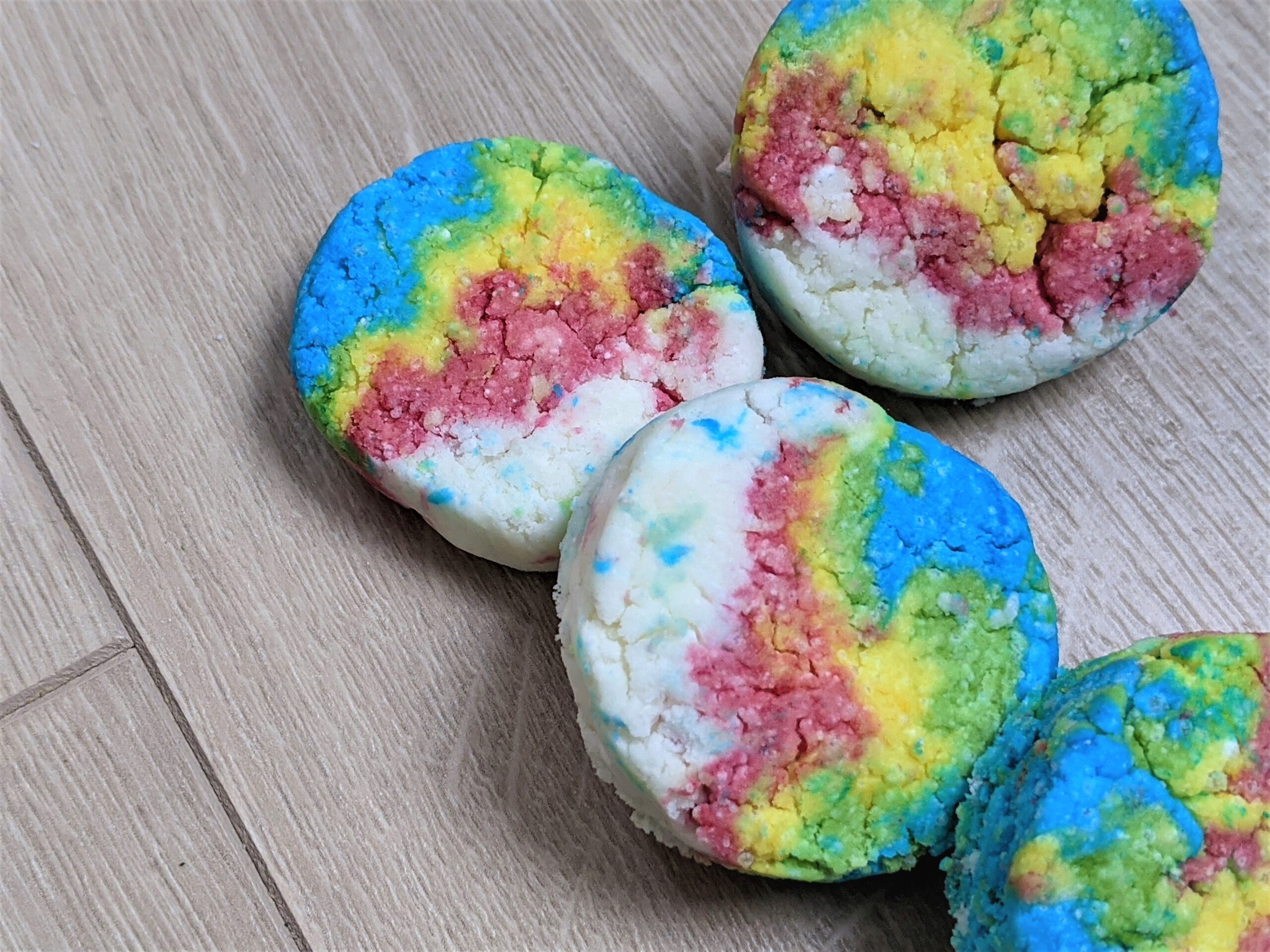 Meng de ingrediënten Kleurstof in de gewenste kleuren Leg de gekleurde massa’s in laagjes op elkaar Vorm tot een rol en snijd in stukken