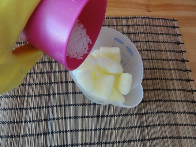 Tip: Je kunt ook ongeveer 20 tot 30 g van de benodigde hoeveelheid melk als vloeistof gebruiken. Je kunt dit vloeibare melkresidu gebruiken om de eerste NaOH-kristallen op te lossen en zo heb je al wat loog geproduceerd. Het oplossen van de melkijsblokjes is dan iets gemakkelijker.