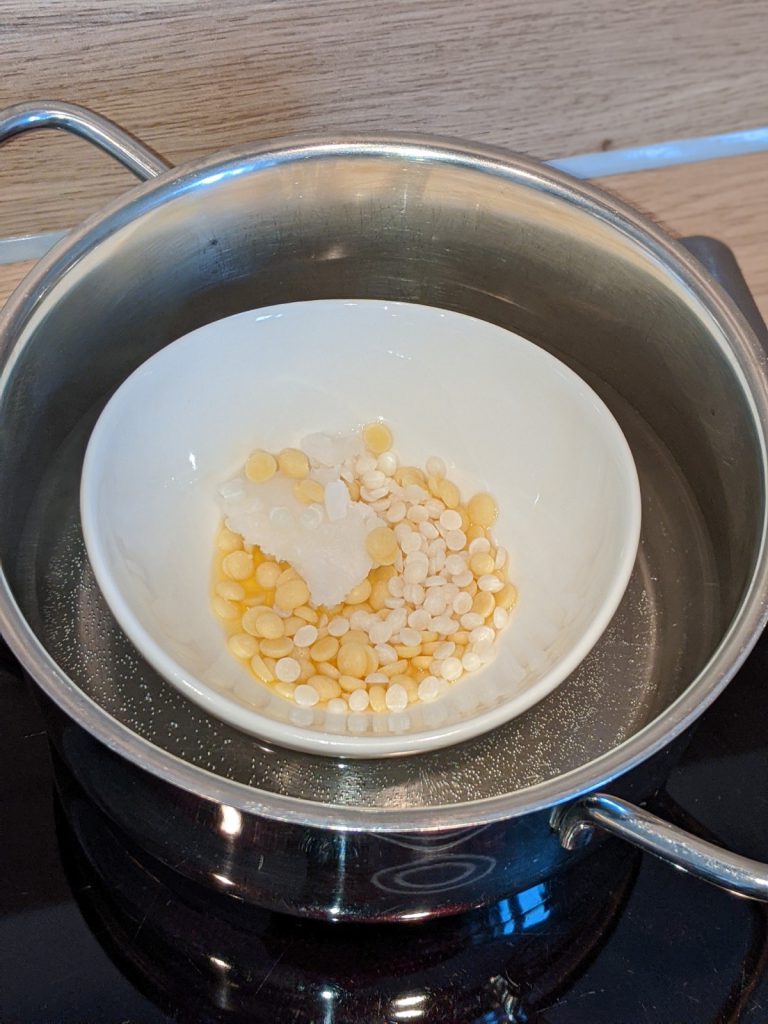 Wil je je eigen SOS balsem maken? Ga dan aan de slag: smelt eerst de was en het vaste vet. Smelt eerst de gekozen was, verlaag dan de temperatuur en voeg de karitéboter toe. Je kunt de was en sheaboter smelten in een kom of direct in een glazen pot in een bain-marie of gebruik een beker en een kookplaat. Roer voortdurend.