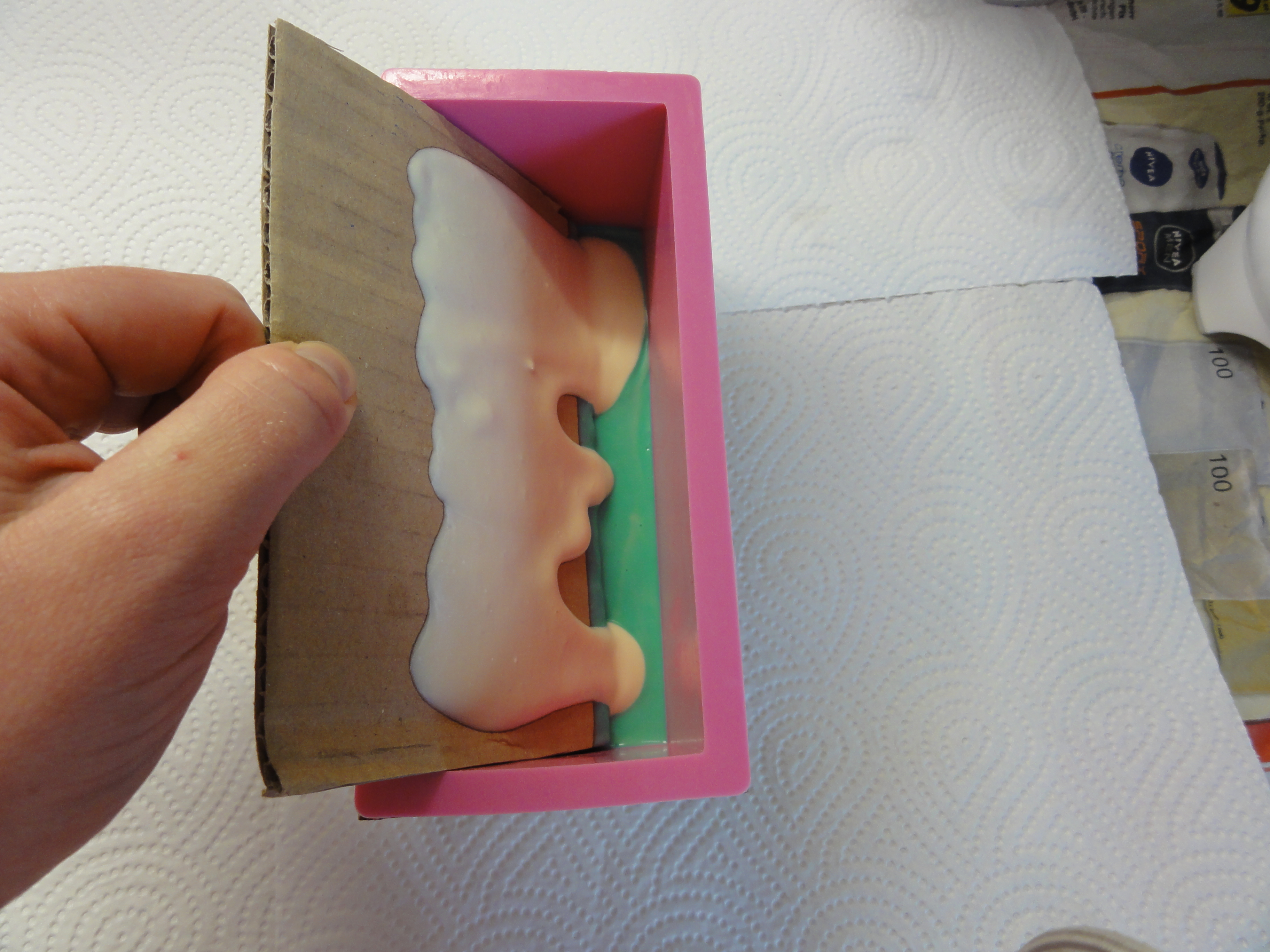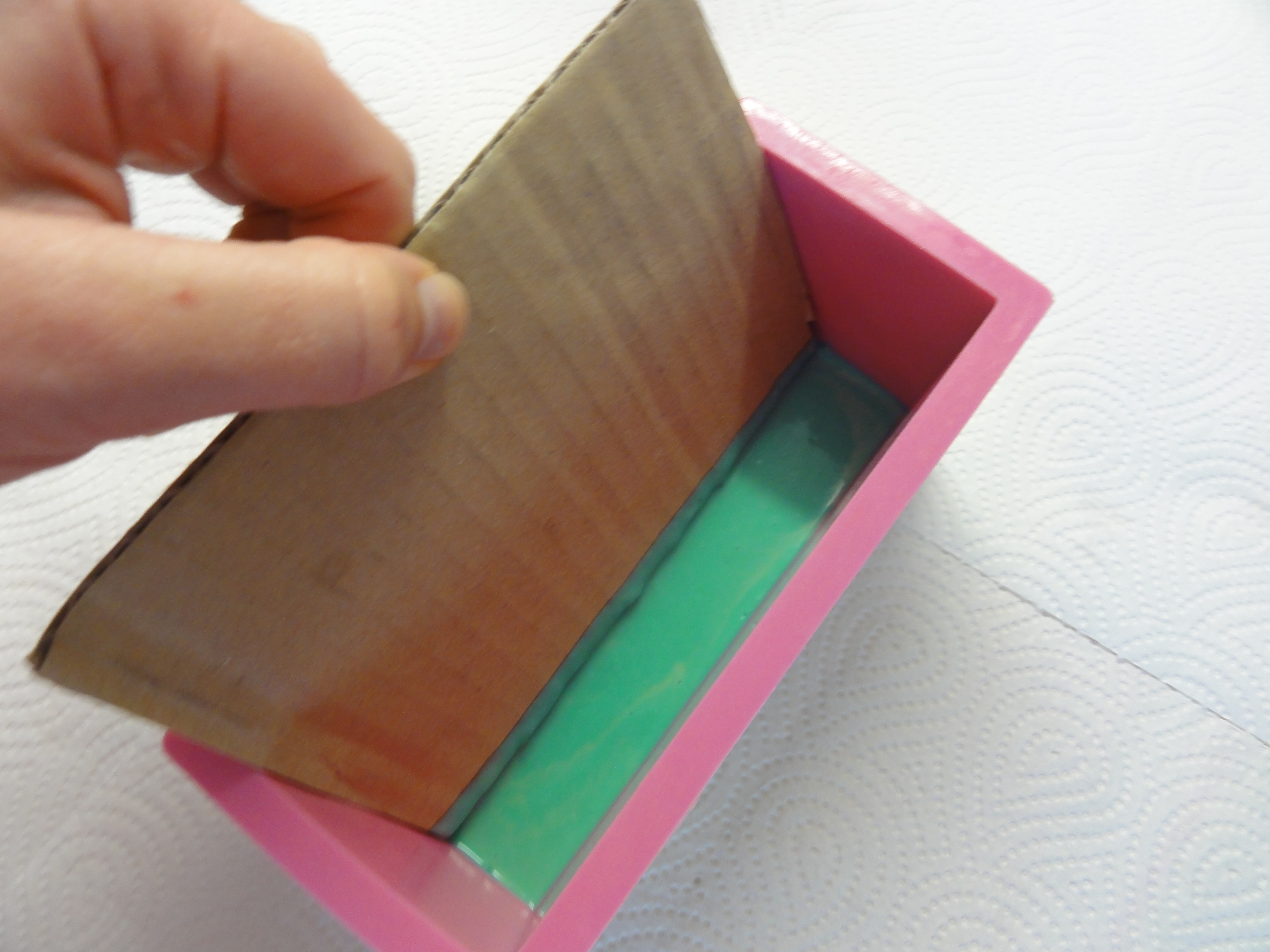 8. Leg het karton aan de kant en giet dan de overgebleven groene zeeplijm in de zeepmal. Let op het volgende: De groene zeeplijm zou te diep intrekken als je het zomaar in de mal giet. Giet het daarom langzaam en voorzichtig met een spatel in de zeepmal.