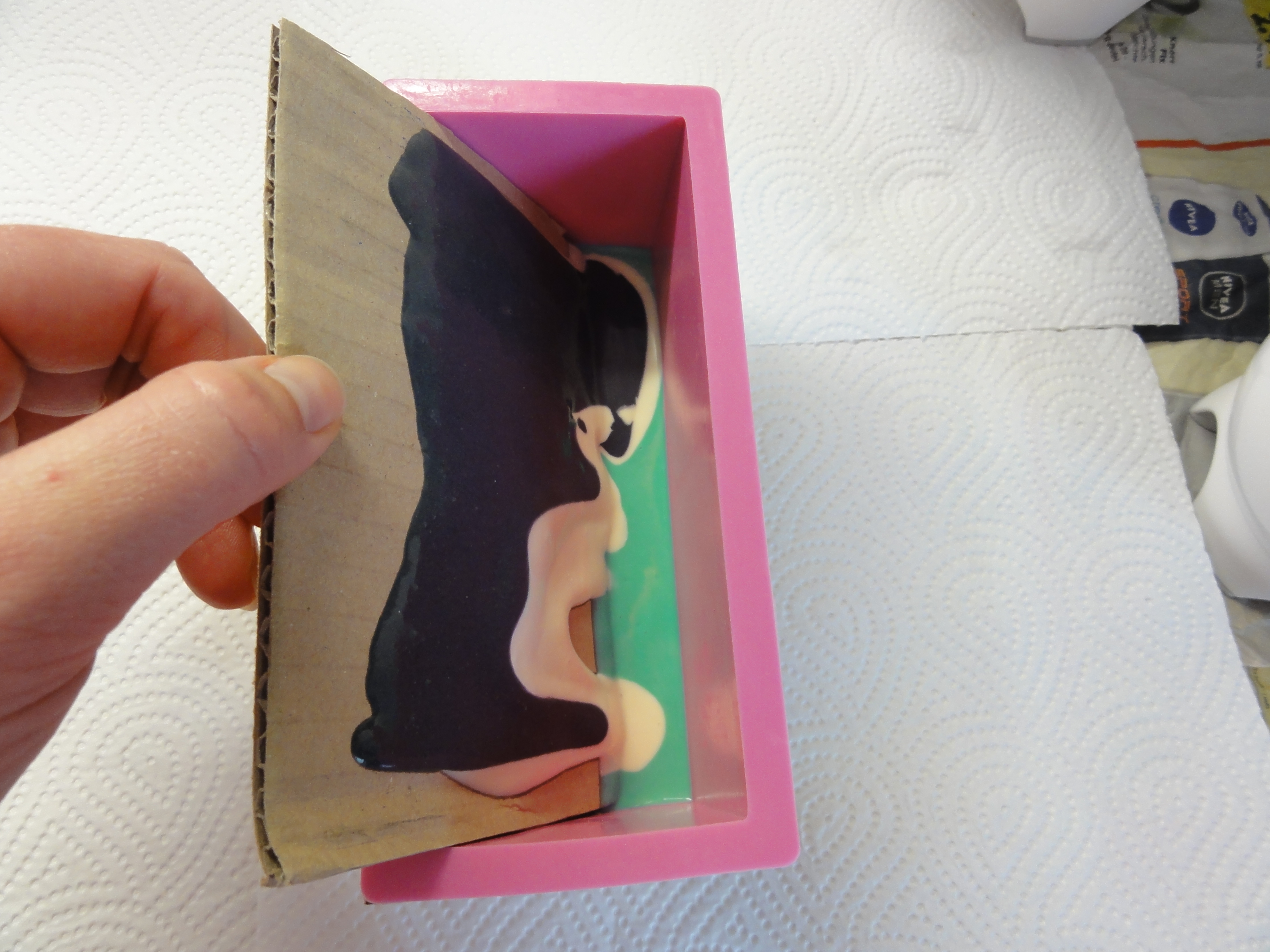 7. Zodra zowel het witte als het zwarte deel van de zeeplijm bijna volledig zijn gebruikt, verwijder dan voorzichtig het karton en gebruik een spatel om eventueel achtergebleven zeepmengsel dat nog aan het karton vastzit eraf te schrapen.
