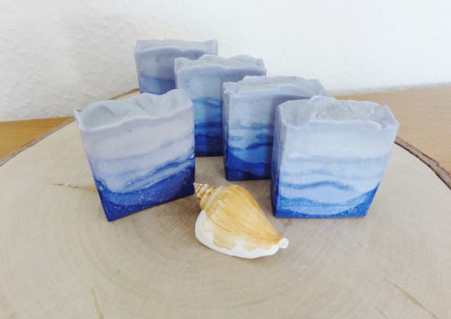 Om de zeep in verschillende tinten blauw te maken, is eerst ongeveer 1/3 van de zeeplijm verwijderd en diepblauw gekleurd. De blauwe zeeplijm werd in de zeepmal gegoten, zodat de bodem van de mal goed bedekt was met zeepmengsel. Giet nu een lepel van het witte, ongekleurde deel in de overgebleven blauwe zeeplijm. Dit mengsel wordt vervolgens op het blauw in de mal gegoten. Ga zo door tot de zeepmal gevuld is. Een ander idee voor een natuurlijke zeep die doet denken aan de zee is om het onderste gedeelte geel te kleuren en te mengen met zand of klei . Dit geeft het effect van een zandstrand met de golven van de zee.