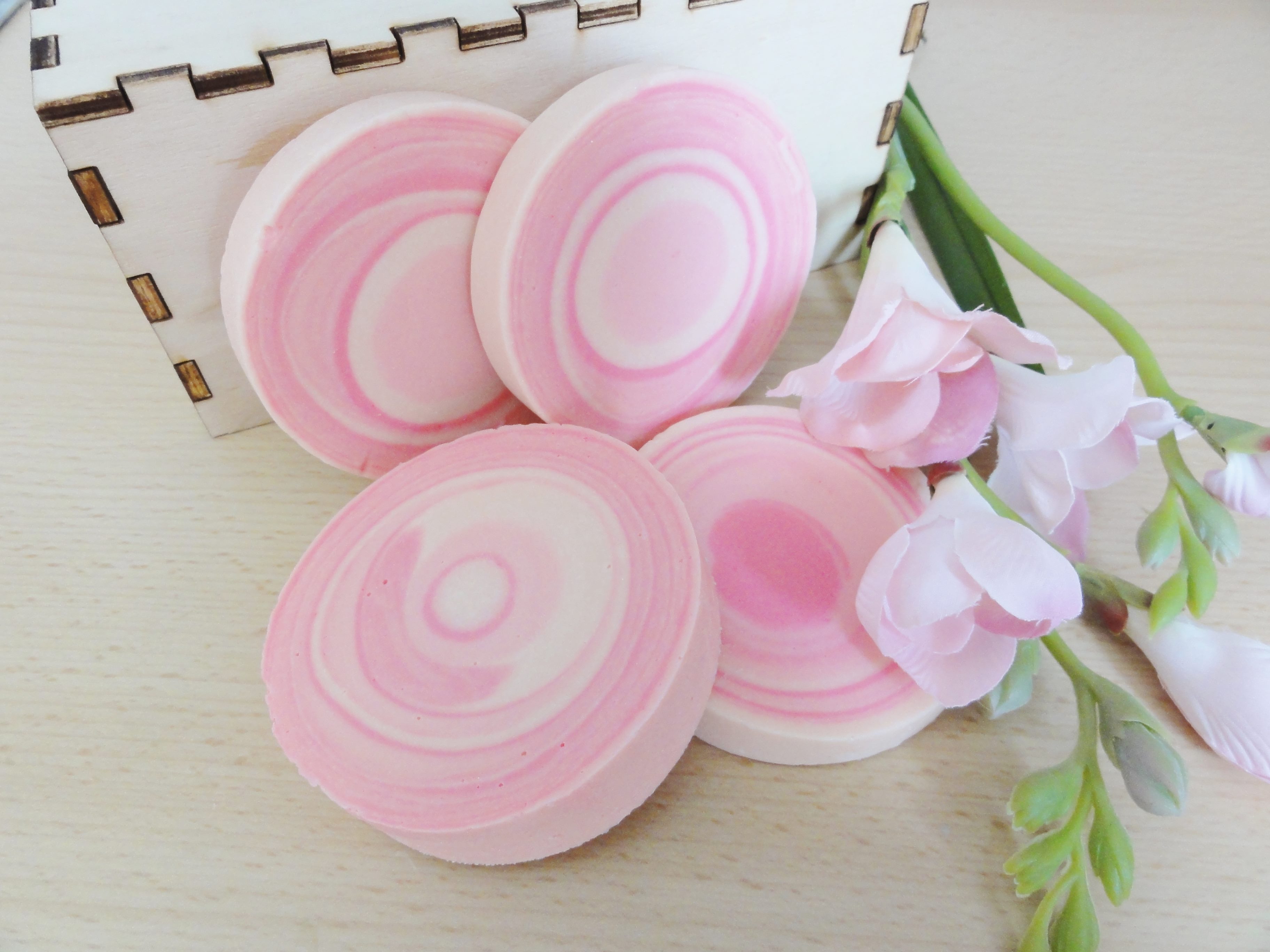 Kleurstof: 1 volle theelepel titaandioxide in de loog, zeepkleur roze (gemengd in drie kleurintensiteiten)